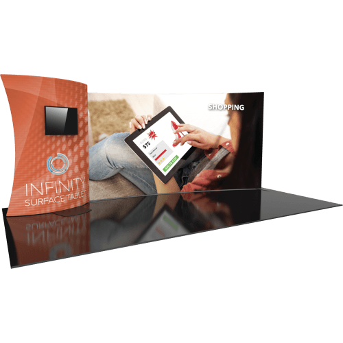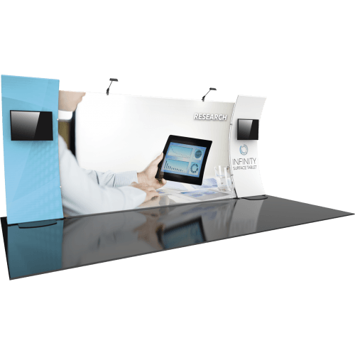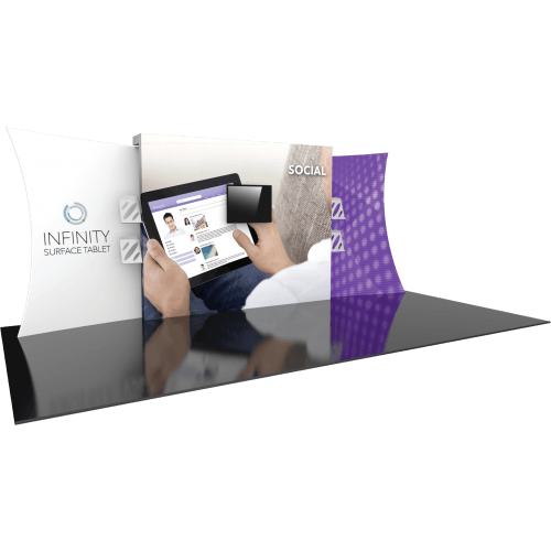 Formulate® Designer Series 20ft Backwall Kit 01 display has organic, flowing shapes and is portable and easy to assemble. The kit includes an aluminum tube frame with snap-buttons/spigot connectors and zipper pillowcase fabric graphics. Simply connect the tubes, pull the pillowcase fabric graphic over the frame and zip.