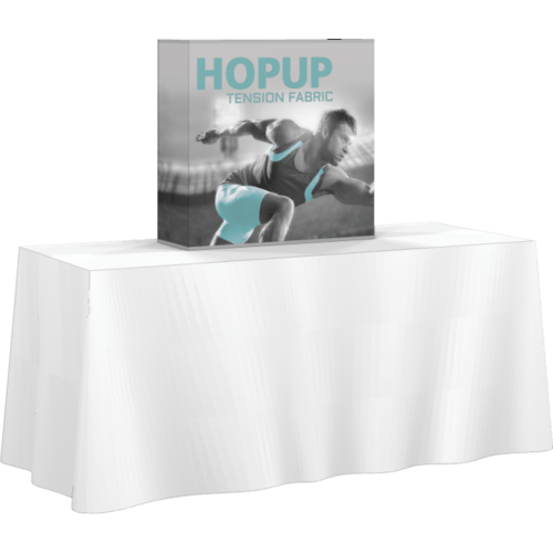 Hopup™ 2.5ft (1 quad x 1 quad) tabletop tension fabric display is a simple, versatile and easy to set up display. Hopup 1×1 Straight features a lightweight, durable aluminum frame and a Velcro-applied, straight fabric mural with or without endcaps. Simply attach the graphic, pop (expand) the frame and you have a tabletop display – no tools are required for assembly! A rolling carry bag for storage and transport is included. Option available to purchase the frame only.