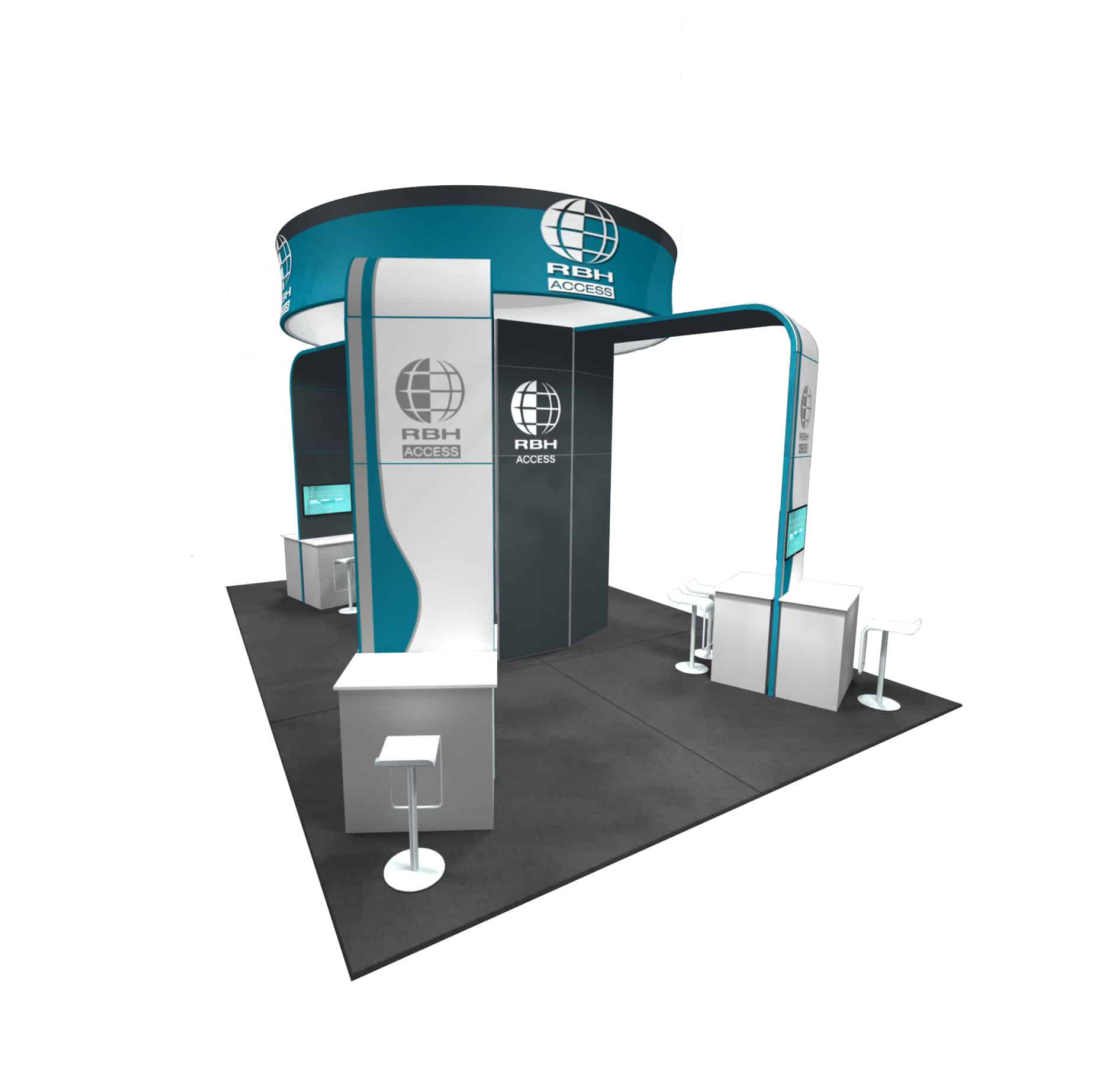 Catch the eyes of competitors and potential clients with the RBH 20×30 trade show exhibit. Add a large hanging sign over this island booth to add even more attraction on the show floor. With seating and counters on the four corners of this display, there is ample space for clients and potential clients to converse and check out what your company has to offer. This great booth is available as a purchase or rental!